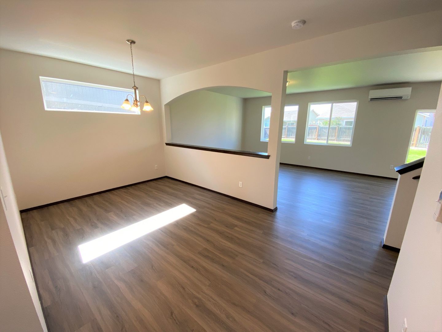 Each room has a dedicated mini-split heat pump for your comfort. Spacious open floor plan with dining room, living room and kitchen opens to the fenced back yard with covered back patio! Beautiful kitchen features granite countertops and island with counter-height seating. Stainless steel appliances include counter-depth refrigerator, dishwasher, range with glass cooktop and air-fry function, and built-in microwave! Vinyl plank flooring downstairs. This home will be energy efficient with the mini-split heat pumps, heat pump hot water heater, LED lights and new appliances!