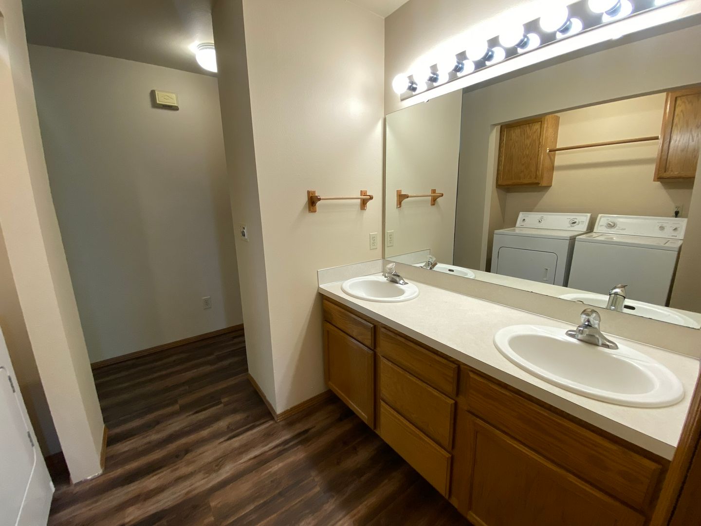 This unit has 3 bedrooms and 1 bathroom. The bathroom has double sink vanity, and shower/toilet are in a separate room for very roommate friendly use. Provided washer/dryer with cabinet storage.
