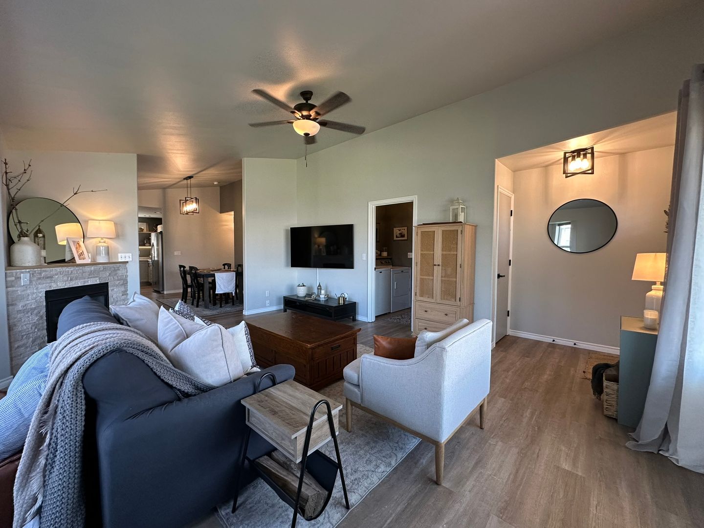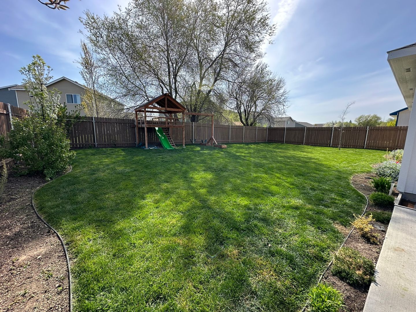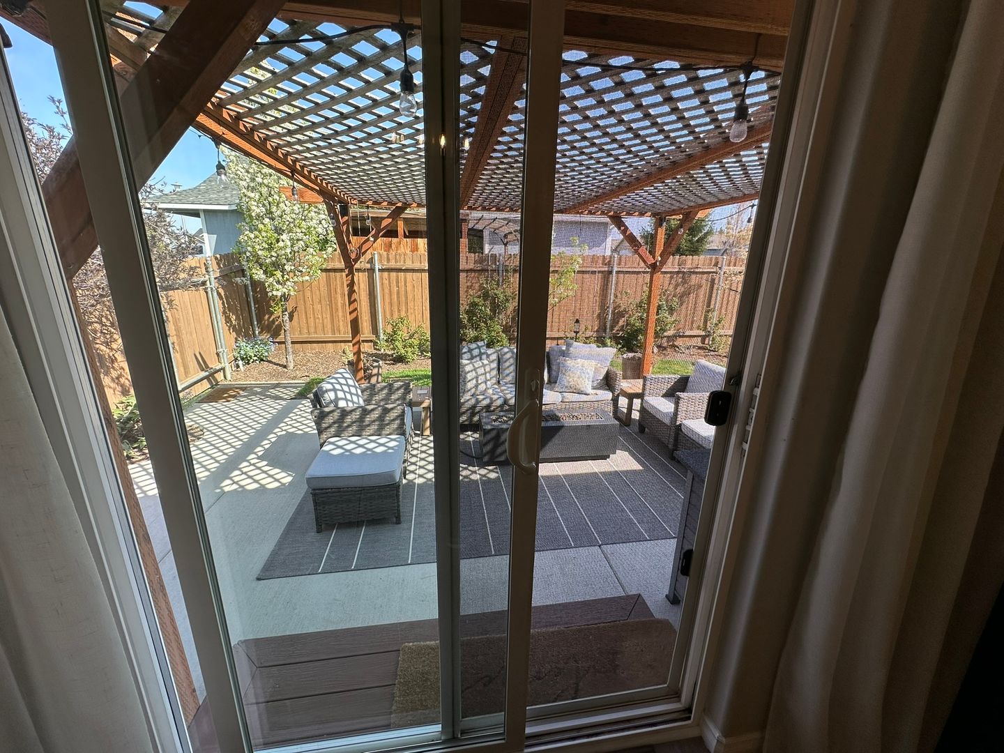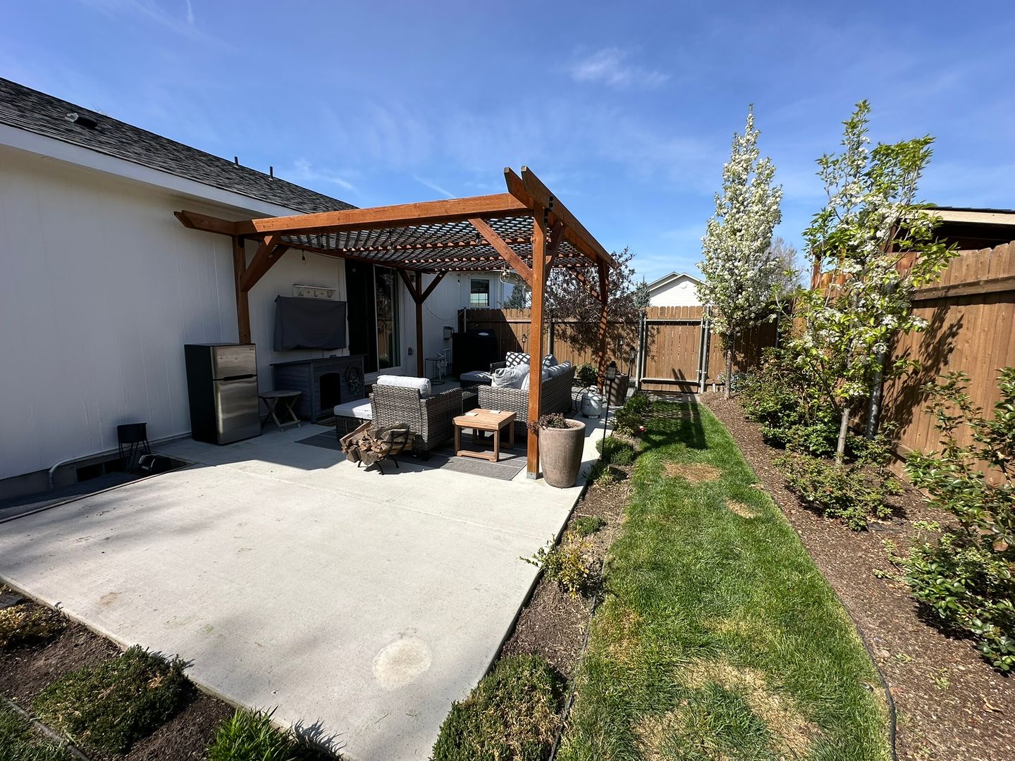 Beautiful and well cared for 3 bed, 2 bath home with a backyard oasis! Available to reserve now for an approximate early to mid July lease start. This home has upgraded finishes and hard flooring throughout. Living room has high ceilings, a corner gas fireplace and many windows for natural light. The kitchen comes fully equipped with stainless steel appliances, plenty of cabinet space plus open shelving. The spacious master bedroom has a private bathroom complete with tile shower and glass doors. The 2 additional bedrooms are both generously sized. Washer and dryer in laundry room are included. Keep comfortable with central heat and air conditioning. 2 car attached garage. Enjoy your beautiful landscaped outdoor space in front and back, including a fenced back yard with back patio and pergola. The yard has an underground sprinkler system and landlord pays for lawn care!