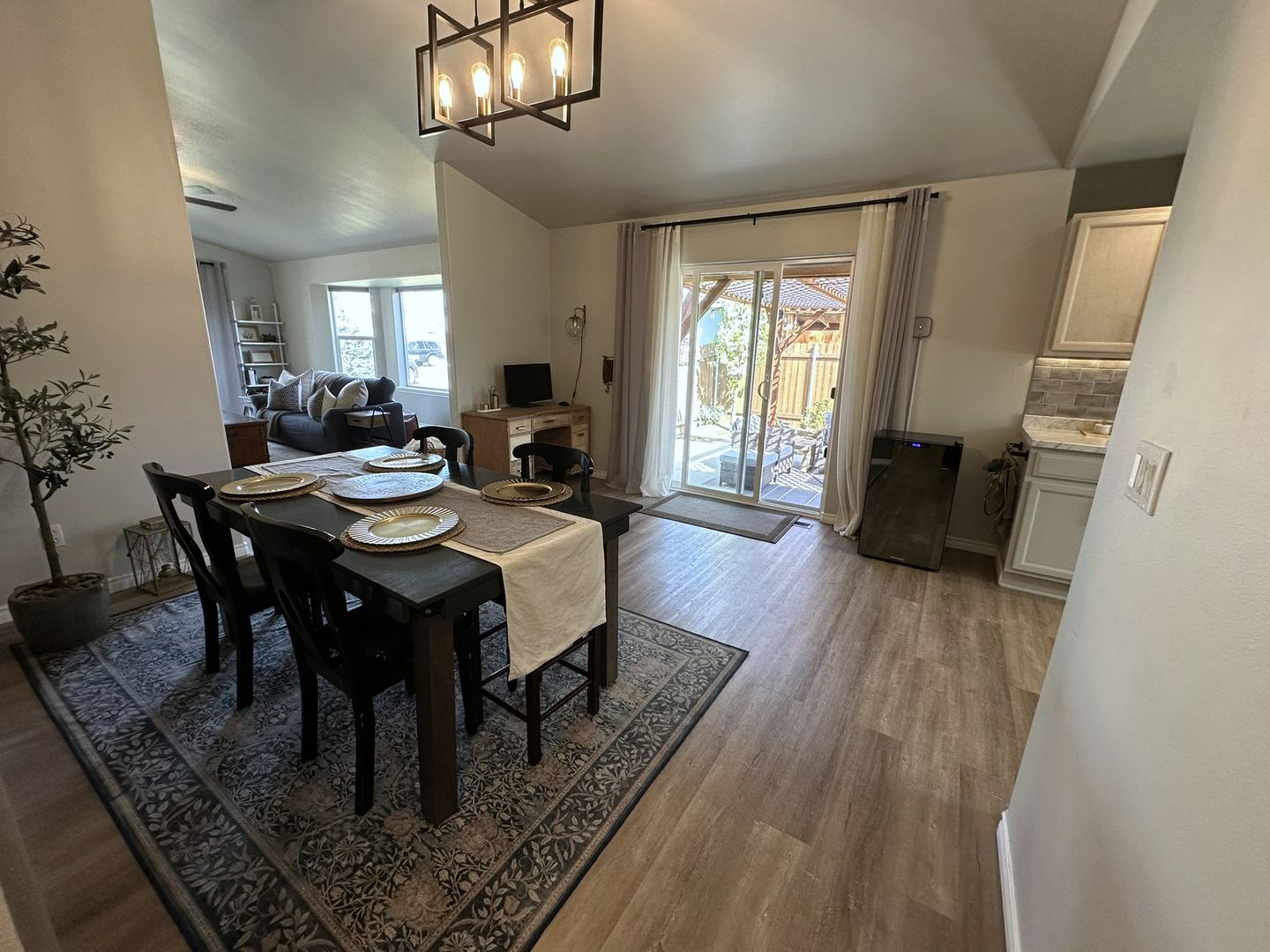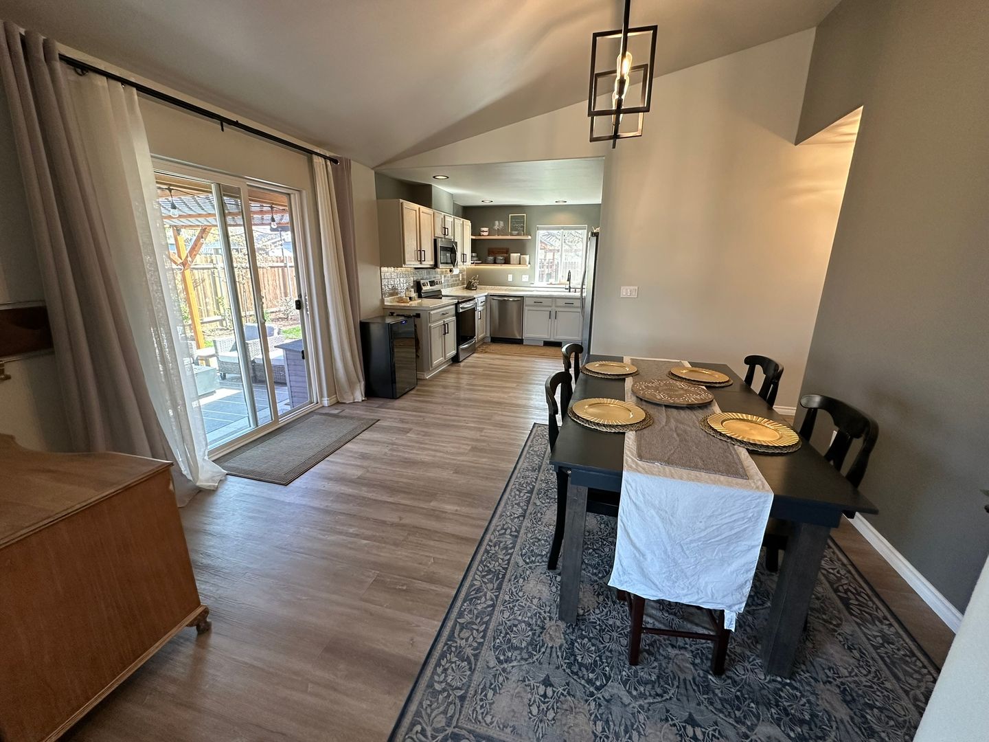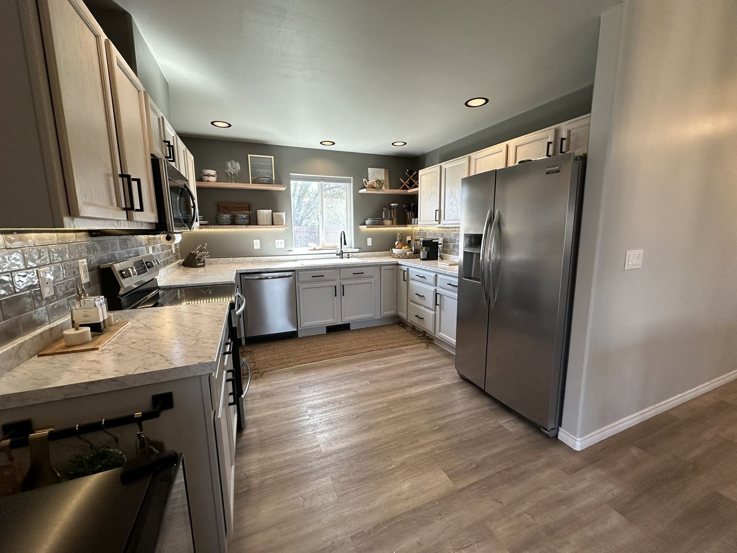 Beautiful and well cared for 3 bed, 2 bath home with a backyard oasis! Available to reserve now for an approximate early to mid July lease start. This home has upgraded finishes and hard flooring throughout. Living room has high ceilings, a corner gas fireplace and many windows for natural light. The kitchen comes fully equipped with stainless steel appliances, plenty of cabinet space plus open shelving. The spacious master bedroom has a private bathroom complete with tile shower and glass doors. The 2 additional bedrooms are both generously sized. Washer and dryer in laundry room are included. Keep comfortable with central heat and air conditioning. 2 car attached garage. Enjoy your beautiful landscaped outdoor space in front and back, including a fenced back yard with back patio and pergola. The yard has an underground sprinkler system and landlord pays for lawn care!
