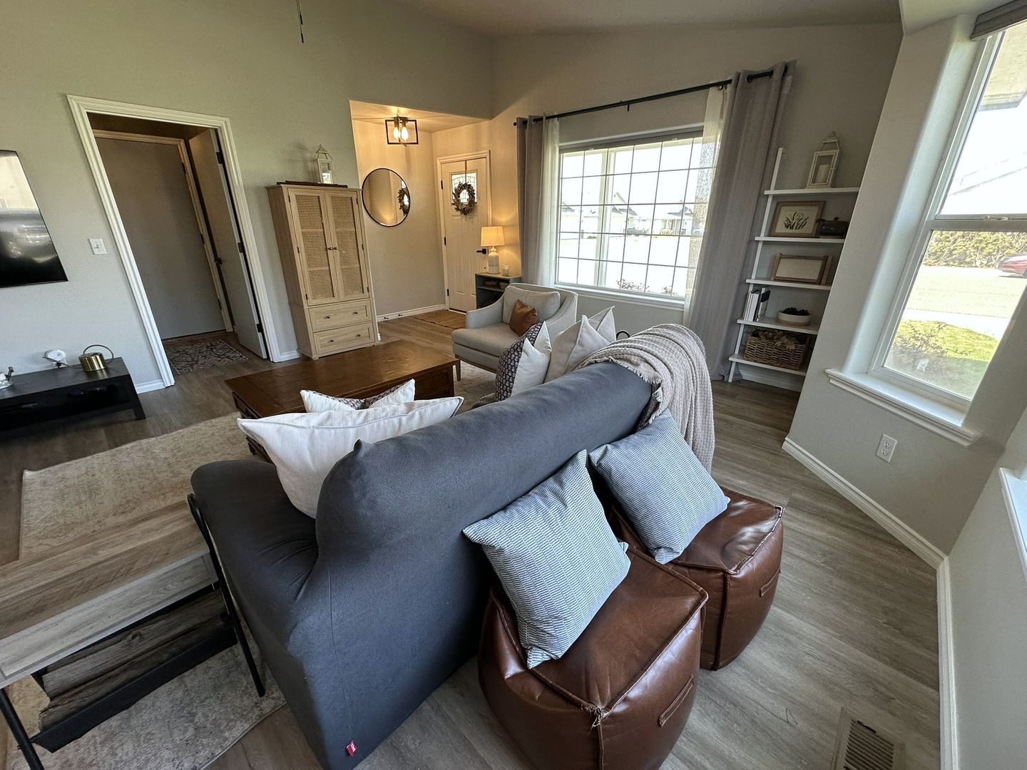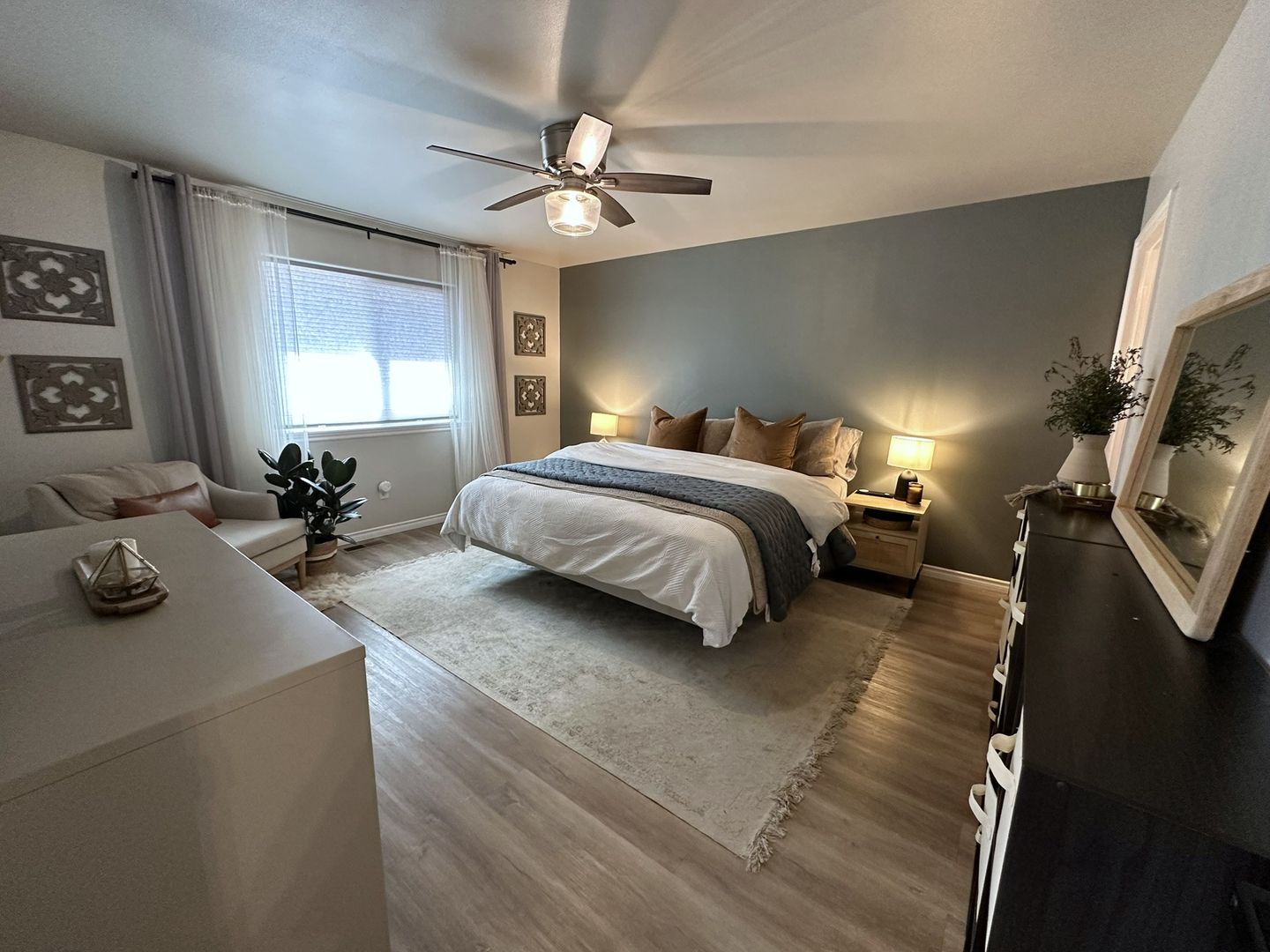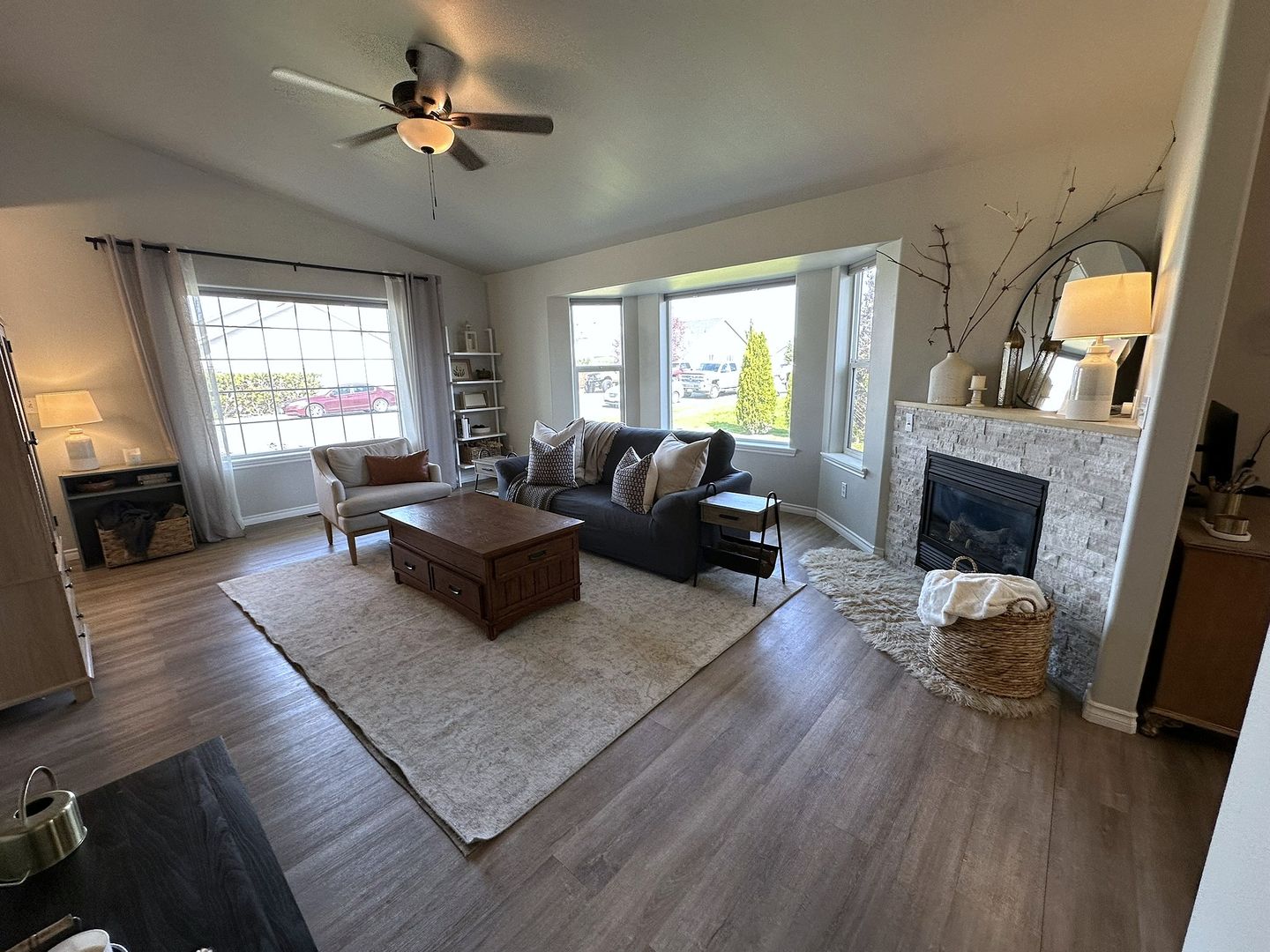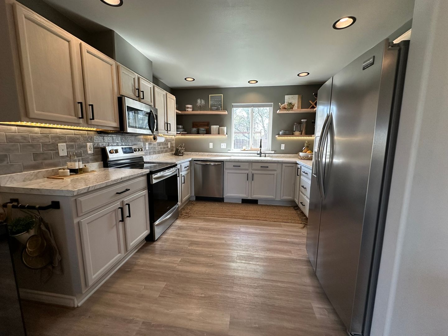 Beautiful and well cared for 3 bed, 2 bath home with a backyard oasis! Available to reserve now for an approximate early to mid July lease start. This home has upgraded finishes and hard flooring throughout. Living room has high ceilings, a corner gas fireplace and many windows for natural light. The kitchen comes fully equipped with stainless steel appliances, plenty of cabinet space plus open shelving. The spacious master bedroom has a private bathroom complete with tile shower and glass doors. The 2 additional bedrooms are both generously sized. Washer and dryer in laundry room are included. Keep comfortable with central heat and air conditioning. 2 car attached garage. Enjoy your beautiful landscaped outdoor space in front and back, including a fenced back yard with back patio and pergola. The yard has an underground sprinkler system and landlord pays for lawn care!
