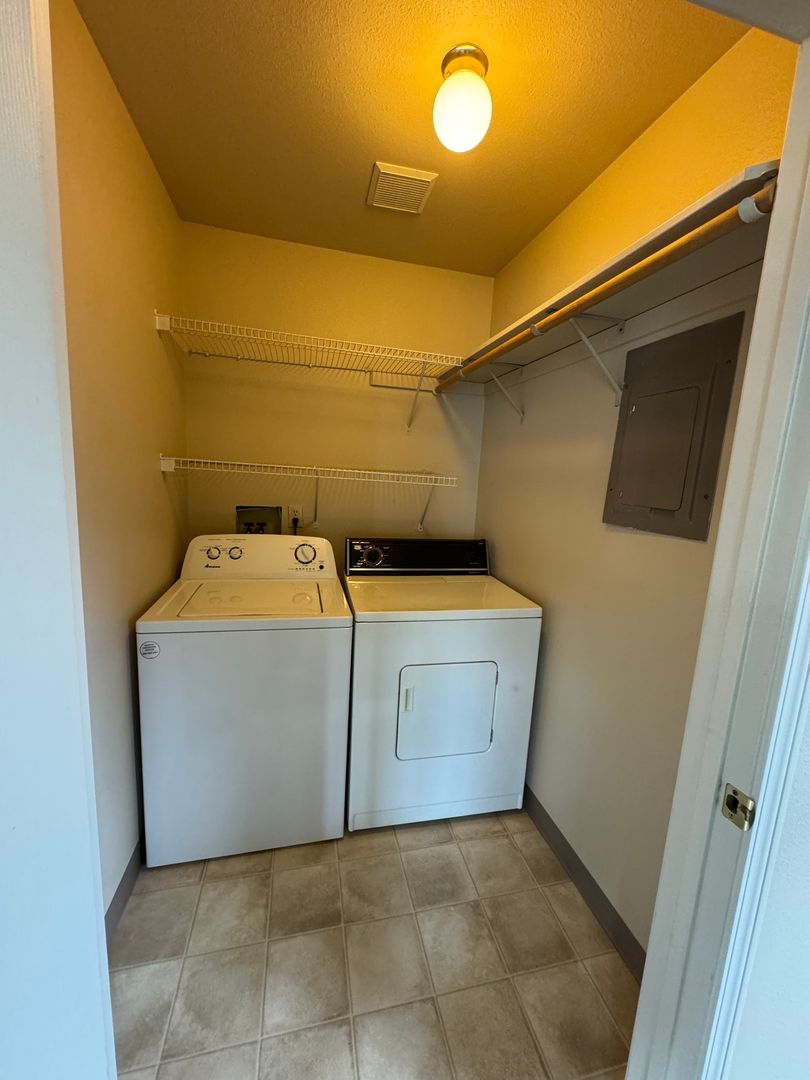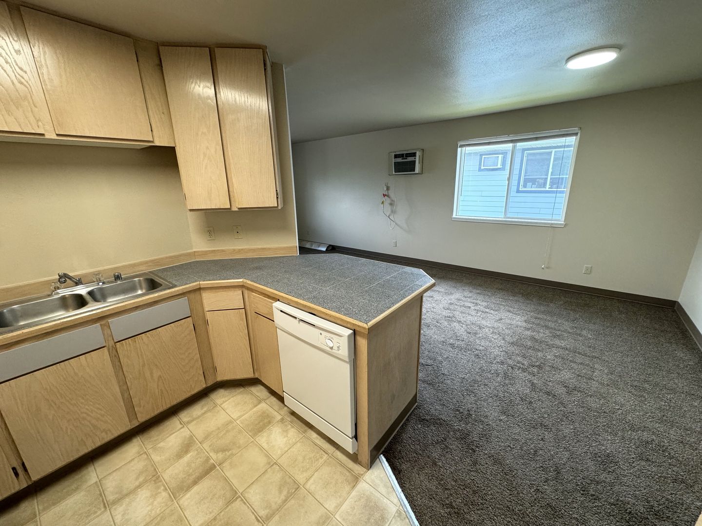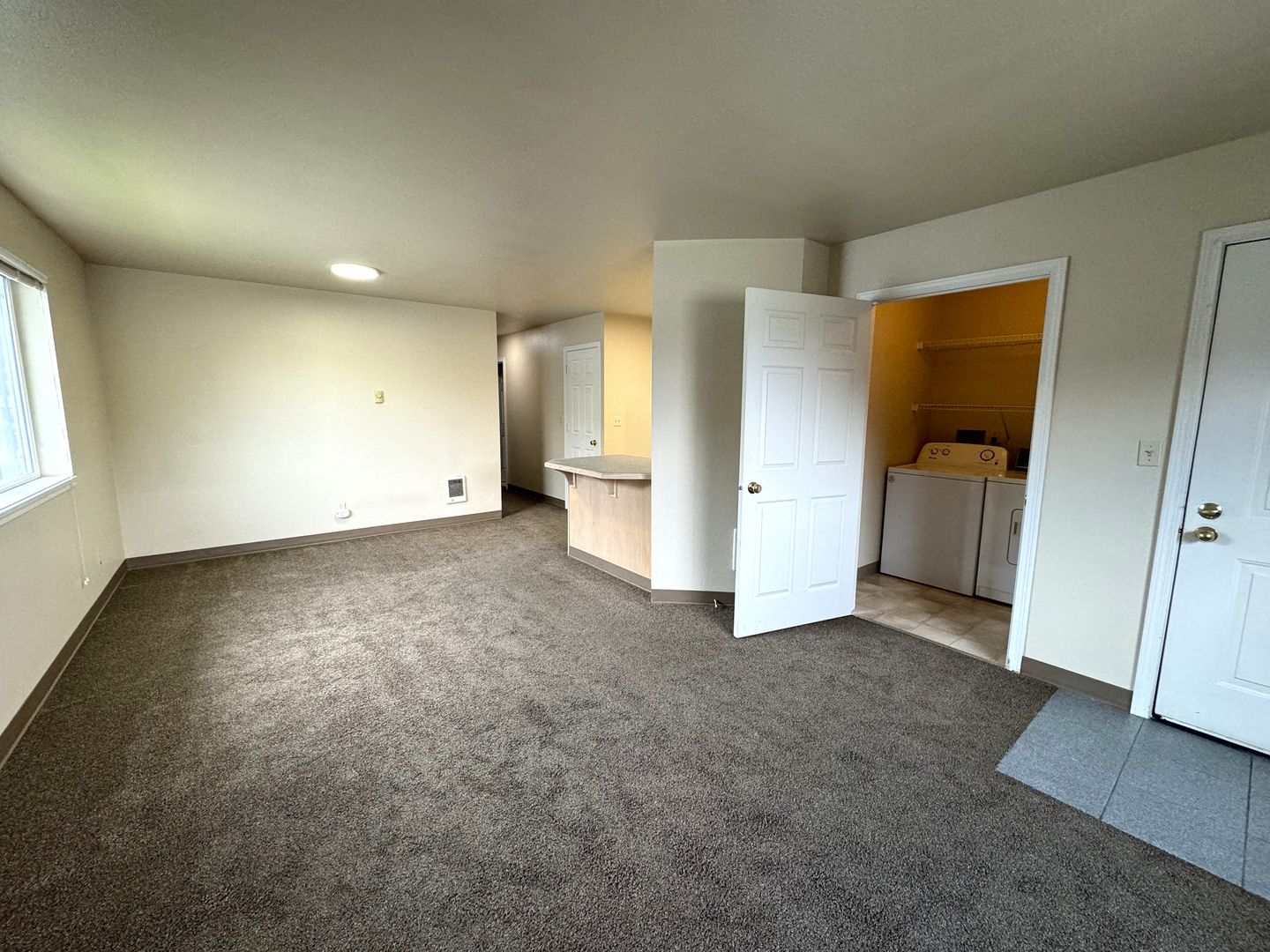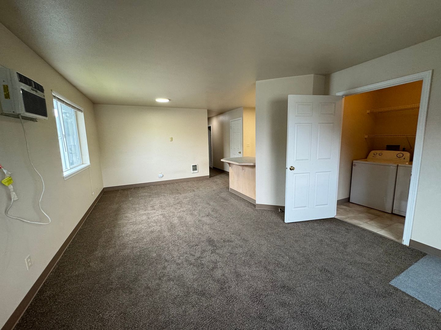 The kitchen is open to living room and dining area, and is equipped with a dishwasher. Washer and dryer are located in a laundry room. Additional storage closet near kitchen. Master bedroom has a large walk-in closet. Second bedroom across from full bathroom. Keep comfortable during the summer with a through-the-wall air conditioner.